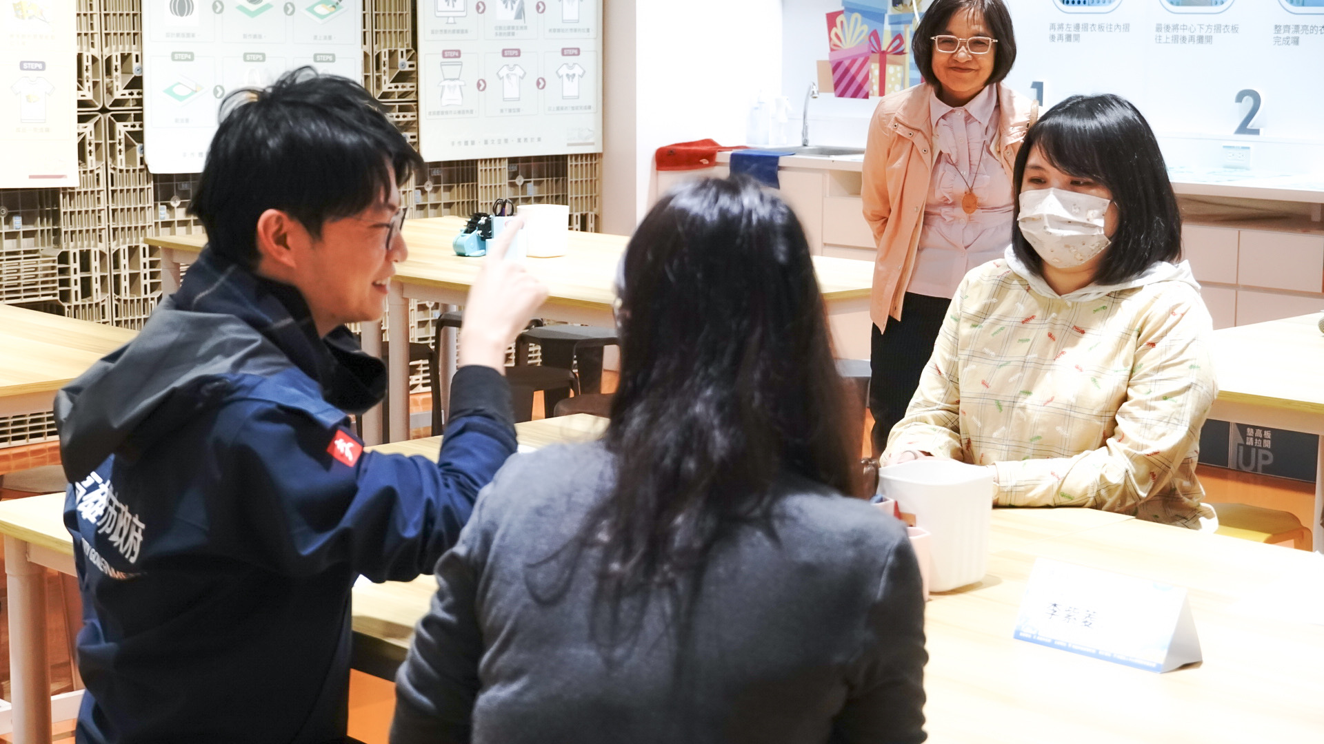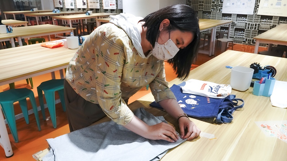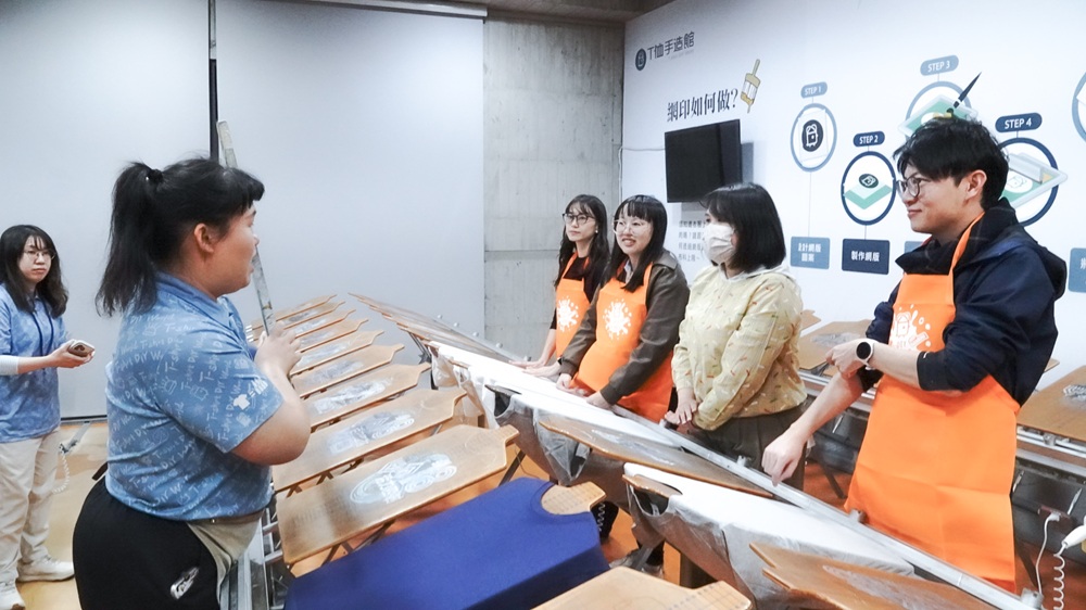 圖三說明:參與「大港青年實習媒合計畫」的郭姓實習生(右二),引導青年局團隊示範手作T-shirt流程。(高雄市政府青年局提供)