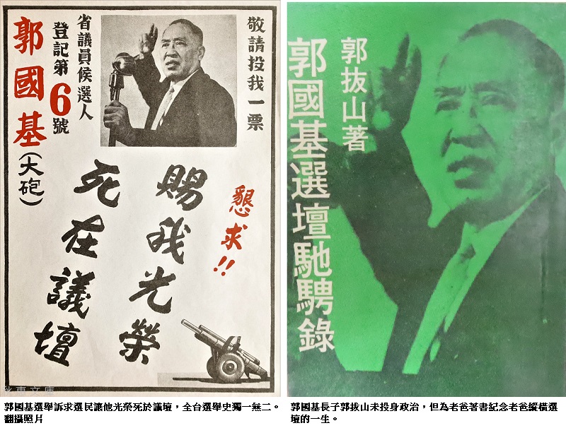 他以詩句中的「拔山」、「蓋世」為兒子命名。長子郭拔山,次子郭蓋世。兩子未投身政治,郭拔山寫了一本「郭國基選壇馳騁錄」著作,紀錄老爸為民主奮鬥的精彩人生。