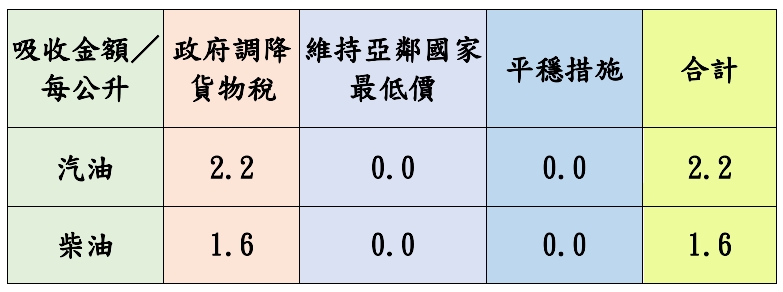 按浮動油價機制調整原則,汽、柴油價格每公升應各不予調整,已低於亞洲鄰近國家(日、韓、港、星)。吸收金額如附表。