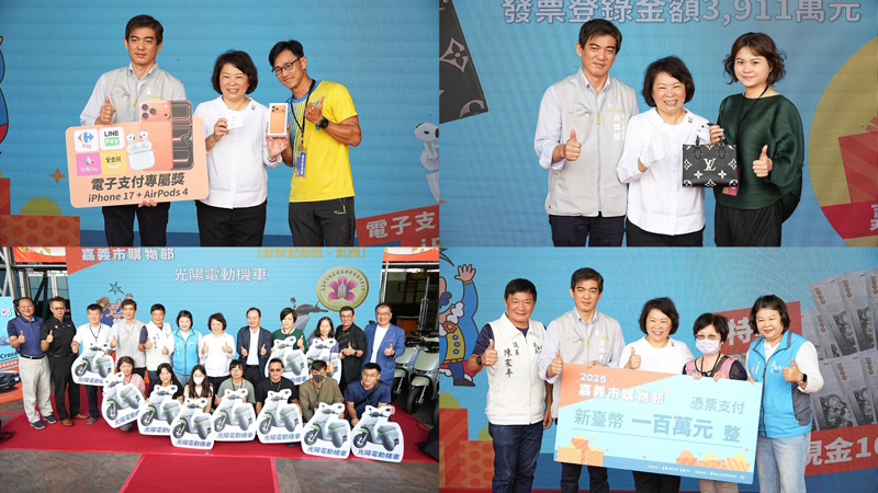 2025嘉義市購物節自7月1日熱烈開跑,於10月12日截止,在大家的熱情參與和支持下,繳出亮眼成績。本屆活動發票登錄總金額高達10.9億元,如果加入嘉義市民專屬滿千送百發票登錄總額更高達13.54億元,其中「嘉購王」的個人消費金額達3,911萬元,雲端發票登錄總額更衝上2.9億元,今(31)日由黃敏惠市長頒發佰萬汽車、佰萬現金、名牌包、光陽電動機車、以及電子支付獎「iPhone 17手機+AirPods耳機」等大獎。黃敏惠市長感謝旅館、店家夥伴以及市民朋友,讓嘉義市購物節成功掀起一股消費熱潮,活絡嘉義市買氣與觀光人潮,展現嘉義市驚人的消費力!