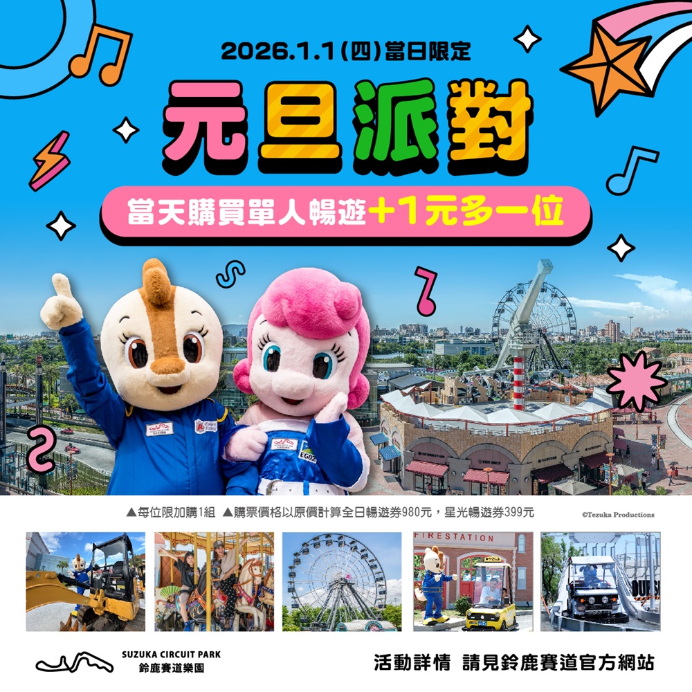 迎接2026年元旦,鈴鹿賽道樂園於元旦期間推出限定活動,從節慶演出到一日限定優惠,提供親子與年輕族群輕鬆安排跨年與元旦出遊行程。1/1(四)當天推出「元旦派對」一日限定活動,祭出「購買暢遊方案,全日暢遊加 1 元多 1 位」優惠,為新年首日增添遊園亮點。