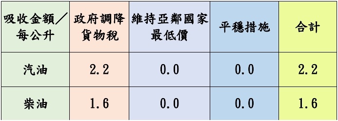 按浮動油價機制調整原則,汽油價格應不調整、柴油每公升應調降0.2元,已低於亞洲鄰近國家(日、韓、港、星)。吸收金額如附表。