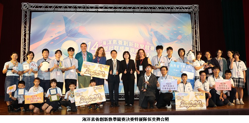 競賽結果最終由臺南市南科實小、臺中市大道國中與新竹市竹東高中以精采的教學演示榮獲特優,同日下午頒獎典禮特別由海洋委員會林麗英處長與國立臺灣海洋大學李明安副校長共同出席,並於現場頒發「表現優異種子教師」及「海洋素養創新競賽優勝隊伍」獎項,公開表揚海洋素養種子教師及社群的專業與投入。典禮首先播放「海洋素養推廣精華影片」,帶領與會者回顧海洋委員會一年來在全國各地推動海洋素養教育的歷程與成果,畫面中從海洋素養種子教師研習、入校教學實踐,到孩子們親手操作海洋科學實驗的身影,象徵海洋素養教育在校園中已逐步萌芽。