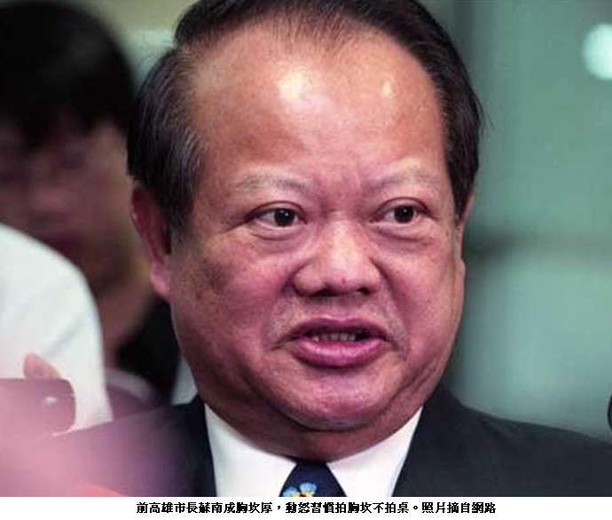 高雄市歷任市長,暴怒時多數拍桌,唯已故前市長「蘇大頭」蘇南成以拍胸坎取代拍桌子。他畢業於成大會統系,服海軍陸戰隊預官役,台南市橄欖球風氣最盛,曾創下台灣區運十幾連霸,他是一代名將,「漢草壯如牛,胸坎很厚實」,但他拍胸坎不是代表保證,而是表示他對某件事氣得捶胸坎,從不怕捶傷胸骨。